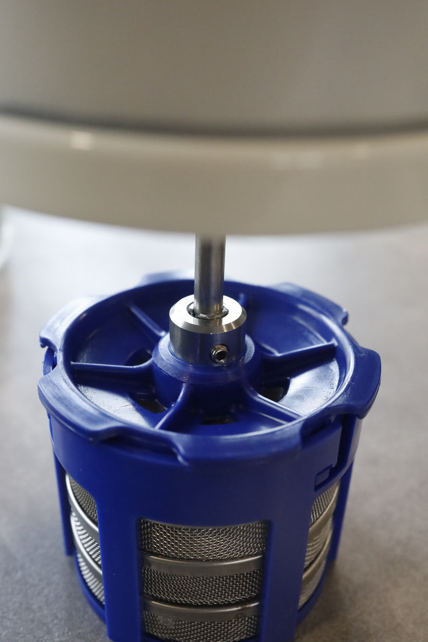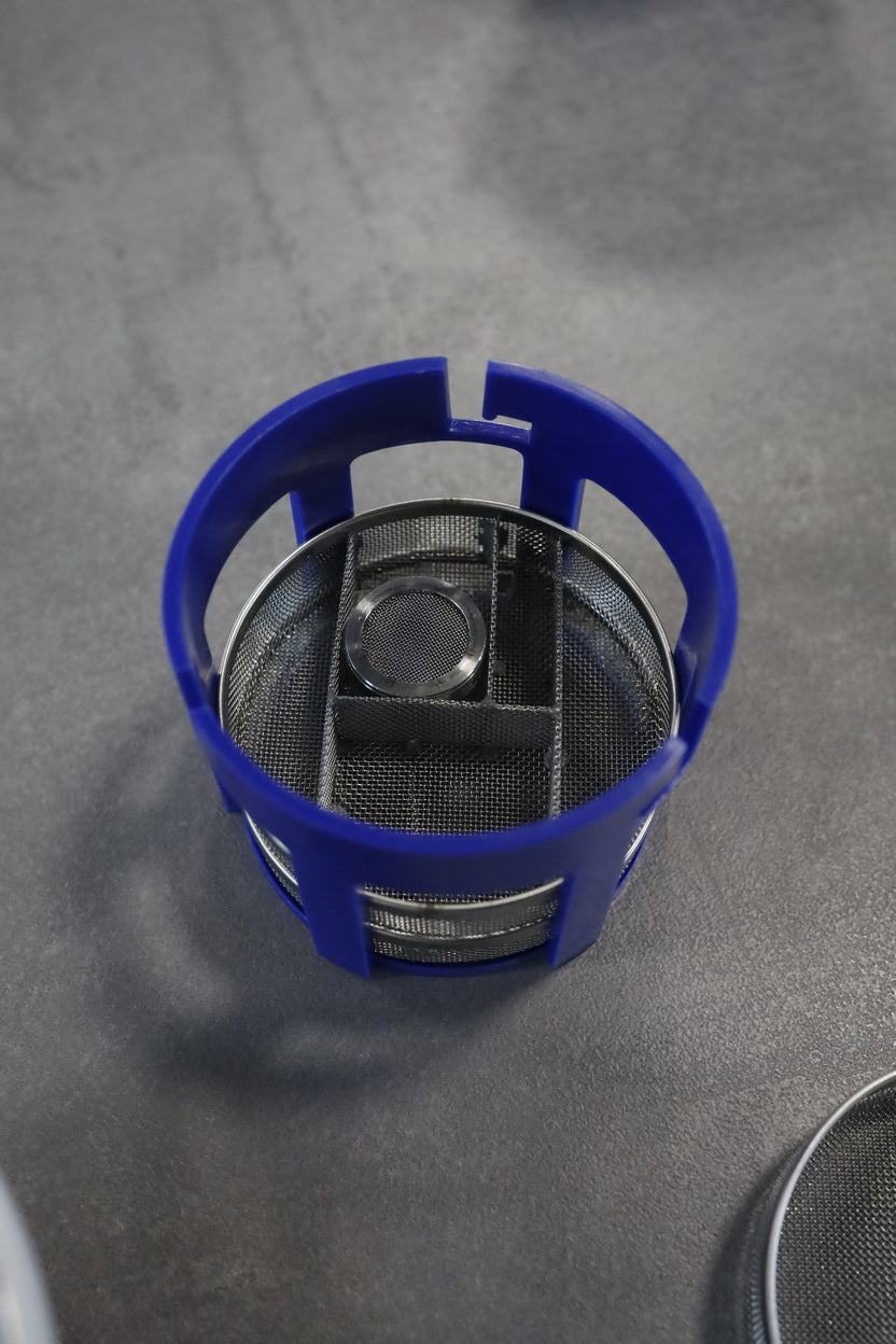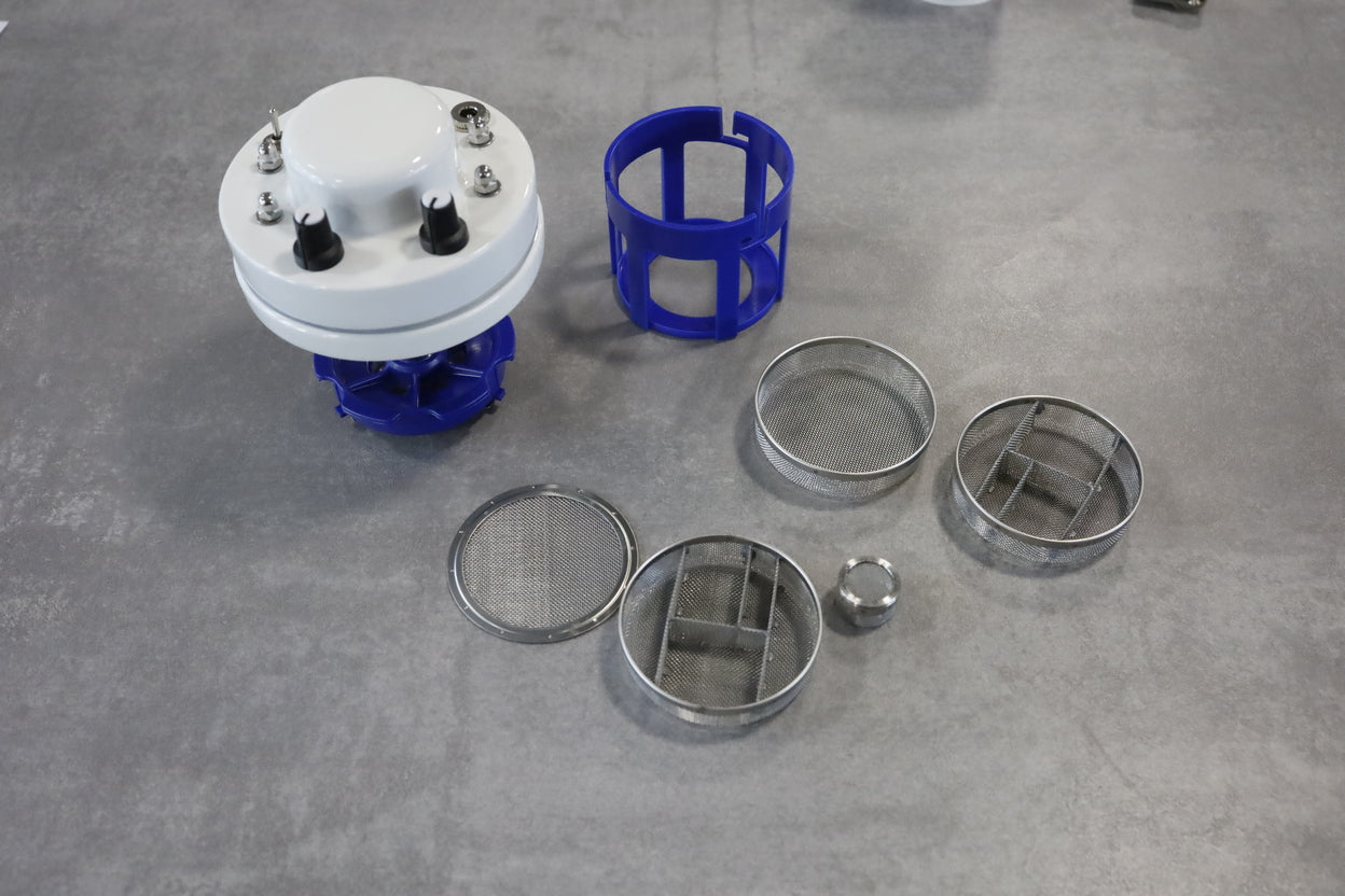 As known from watchmaking, this device achieves a cleaning effect by rotating parts in a cleaning fluid. Larger parts, such as the main plate of a wristwatch movement, can be placed directly into the basket. The delivery includes two glasses, one for cleaning and one for rinsing, such as with distilled water. However, drying the parts must be done externally, for example with a hairdryer or at a low temperature in the oven.